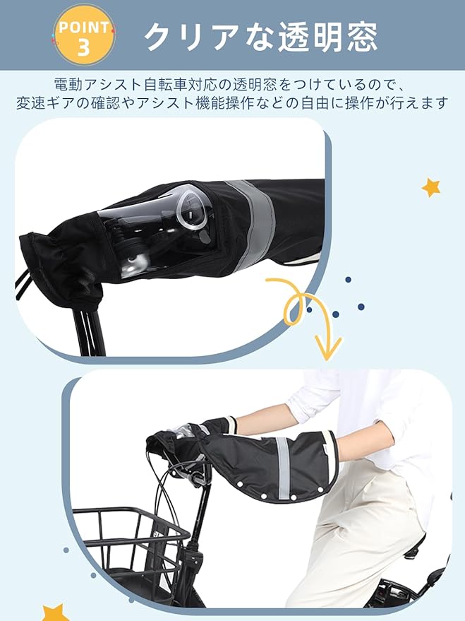 【クリアな透明窓】電動アシスト自転車対応の透明窓をつけているので、変速ギアの確認やアシスト機能操作などの自由に操作が行えます。