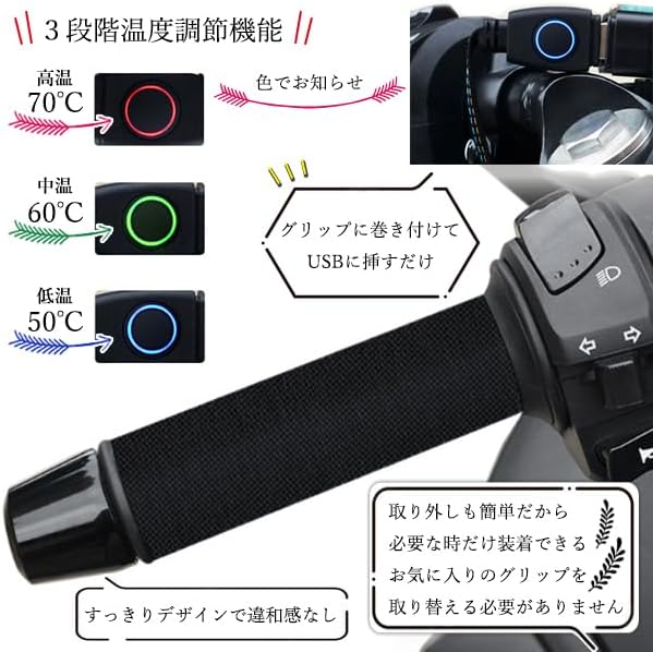 Remarks Japan バイク グリップヒーター USB 巻き付け ホットグリップ 3段階温度調整 取り付け簡単 ツーリング 冬
