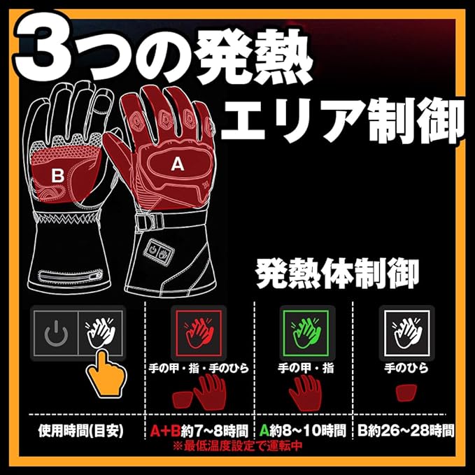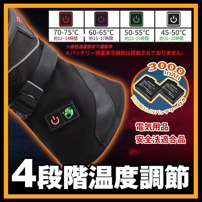 【暖かさを自在に操る、3ゾーン独立加熱&4段階温度コントロール】「手全体」「手の甲・指のみ」「手のひらのみ」という3つの加熱エリアを、状況に応じて個別に選択できる機能を搭載。モードはランプの色(赤:全体、緑:手の甲・指、白:手のひら)で直感的に判別可能です。 例えば、走行開始直後は「全体」で一気に温め、体が暖まったら「手の甲・指」に切り替えるなど、賢い使い方で電力消費を最適化。手のひら単独の最小モードで運用すれば、最大28時間という驚異的な連続稼働時間を誇ります。 さらに、温度は45℃から75℃の範囲で4段階の微調整に対応。その日の気候や個人の寒さの感じ方に合わせ、常に最適なぬくもりを維持できます。 ※本製品にバッテリー残量を確認する機能は備わっておりません。