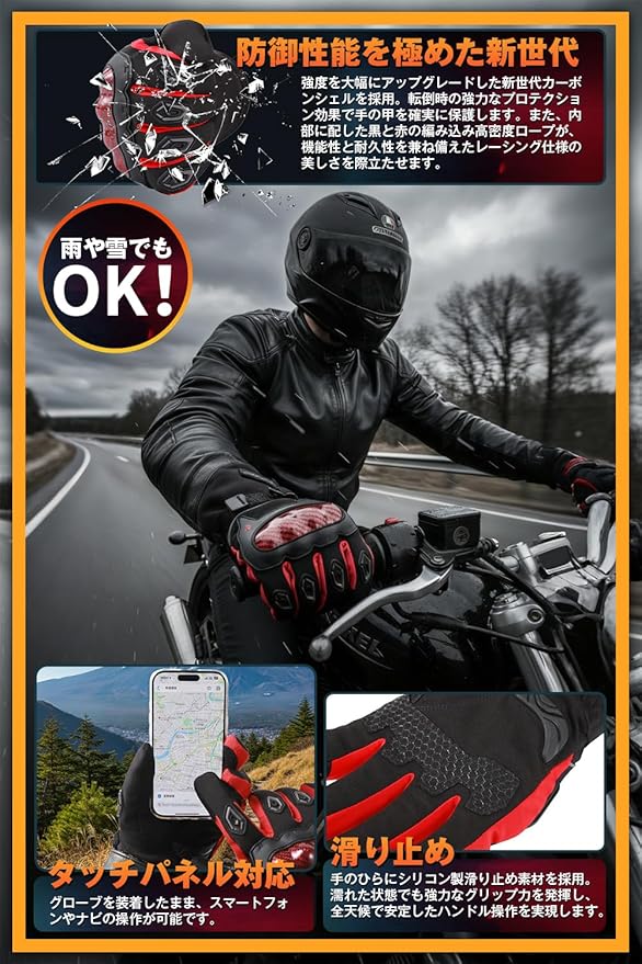 【比類なきタフネスを宿した最新プロテクション】 万一の転倒時に受ける衝撃を最大限に吸収・分散させるため、シェル部材には従来比で格段に強度を高めたカーボン素材を採用。アクシデントの際に最もダメージを受けやすい手の甲を、強固なシェルが徹底的にガードします。 さらに、内部に覗く赤と黒のコントラストが美しい高密度ロープは、機能性だけでなく、耐久性へのこだわりをも感じさせるアクセント。ライダーの闘争心をかき立てる、レーシングスピリット溢れるデザインに仕上げました。