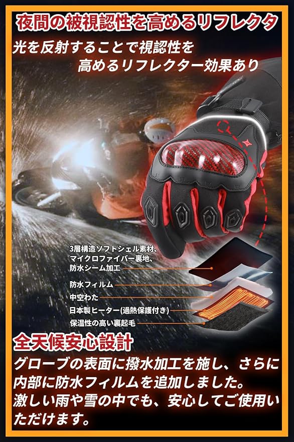 電熱グローブ 11.1V バイク グローブ 冬【高強度カーボンファイバーシェル】 手全体が発熱 4段階温度調節 防寒防水 男女兼用 PSE認証済 [日本正規品] 製品型番R-CF11