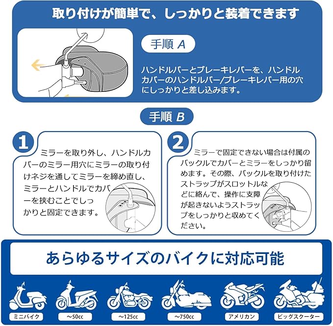 【汎用タイプ】バイクハンドルウォーマーは主に秋と冬に使用されます。いくつかの特殊型のバイクを除き、殆どの大、中、小型のバイクに適用します。ハンドルバーの仕様によって、2種類の取り付け方法があります。
