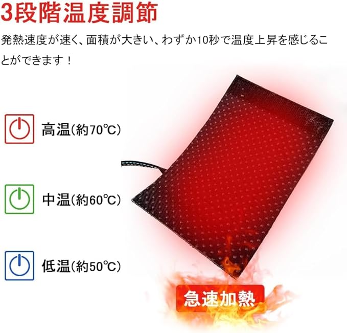 10秒ですぐに暖かい。ケブラー材質を採用し、加熱が早く、熱が均一に広がります。消費電力が低く、使用寿命も長いです。また、本製品は大発熱シートを採用しているので発熱面積が大きく、発熱速度が速いです。スイッチを入れ、電源投入後10秒程度で暖かくなり、寒い冬の屋外で手を温めます!