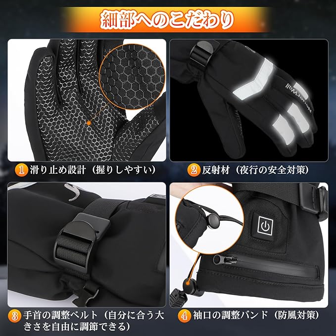 【機能性抜群・防水&防寒&防風&滑り止め】電熱グローブの表地は撥水性に優れ、耐久性も強い素材を採用しており、雨の中での屋外作業やバイク&自転車での通勤シーンなど様々な環境で大活躍です。また、内側は肌に優しい柔らかな毛織物と良い通気性の生地も内蔵されて、長時間つけても違和感なく快適に感じます。手のひらの部分は滑り止め設計でバイクグローブとしては楽々。縫製部分もしっかりしていて、防風性にもこだわって、更に手首のところは締められるので、暖かさが逃しにくい構造になっています。(※完全防水ではないのでご注意ください)