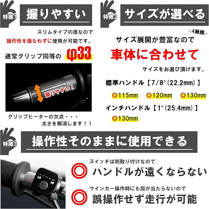 そのような進化の中で、今季は全商品の根本的な見直しをしておグリップヒーター全体に言われている径の太さの問題に取り組みました。また長年販売しているプッシュスイッチタイプに関してもそのスイッチのサイズを見直しております。