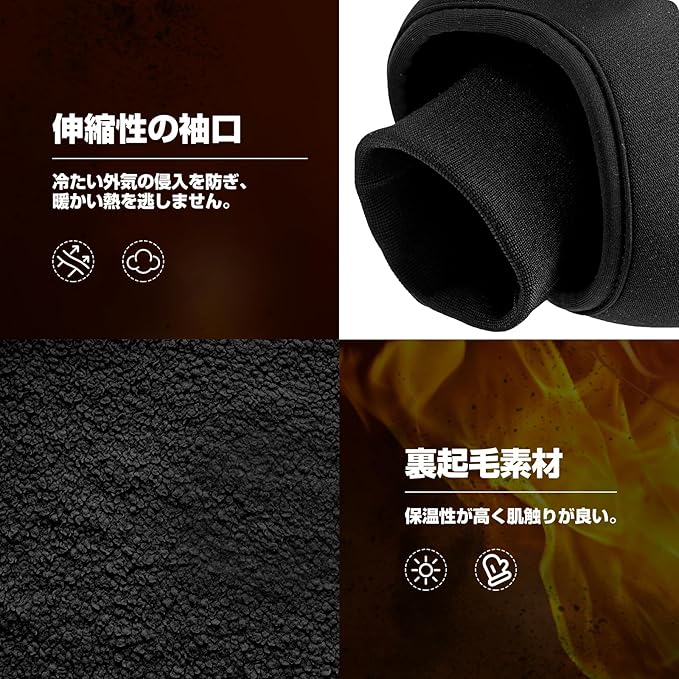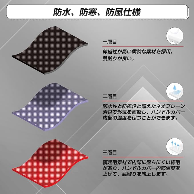 【3層生地構成】製品は3層生地で構成され、1層目は肌触りが良い素材を採用、伸縮性が高く、2層目は防水性と防風性と備えた高級ネオプレーン素材で外気を遮断し、内部の温度を保つ、3層目は裏起毛素材、柔らかく両手をしかっり包み、寒い季節に暖かくバイクを運転できます。