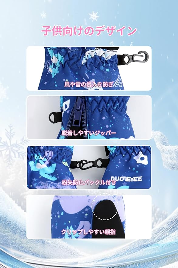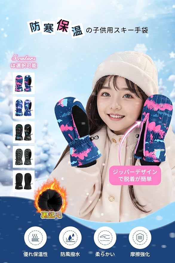 【撥水透湿性】手袋の表面に撥水材質が加工されていて、雪や風を徹底ガードし、手の乾燥を保ちます。スキーグローブは手首が伸縮性ゴム付いて、冷たい風の入りを防ぎ、もっとウォーマーになリます。可愛いデザインを設計されて、男の子、女の子に大人気!色鮮やかで可愛いデザインで目を惹かせて、、冬の外遊びが楽しみになる子様用にぴったりなグローブです。