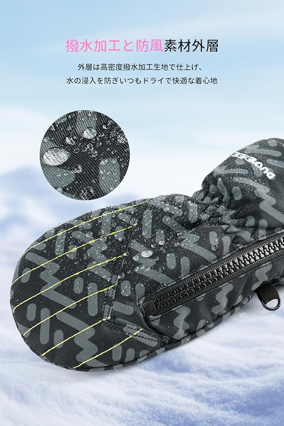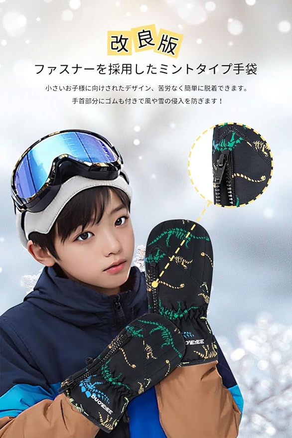 【小さいお子様に向けのデザイン】小さい子供に雪を遊ぶならおすすめできる手袋 キッズです!改良された子供スキー手袋は、便利なジッパーデザインを採用しており、小さなお子様でも簡単に着脱できるようになりました。キュッと縛れるファスナーで、途中にグローブが外されることがなし!ミトングローブは5本指タイプより、縫い目が少なくなり、外気に触れる面が小さく、溶けた雪が縫い目から浸入してしまうことを徹底ガードできて、熱を逃がせず暖かさをしっかりとキープしてくれます。