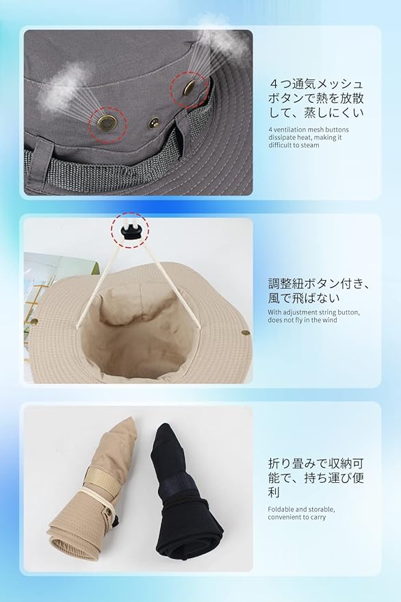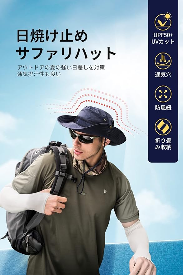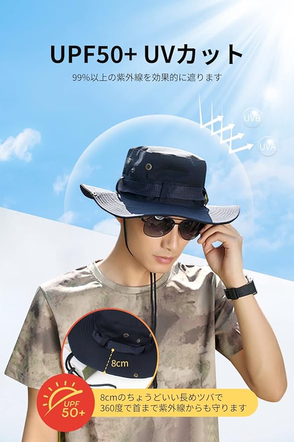 【サファリハット サイズ】:フリーサイズ 周り:約56-58cm 高さ:約9cm つば:約8cm (寸法は手測定しているため、若干の誤差が生じる場合がございます。)対象:メンズ、レディース 5色展開:ブラック、ネイビー、カーキ、ベージュ、グレー、アーミーグリーン【UPF50+UV対策にピッタリ】:つばが8cmの広めで、しっかりに顔、頭、首、耳を有害な紫外線からカットするようにお守りします。熱中症や日差し日差しのきつい季節に欠かせないアイテムです。