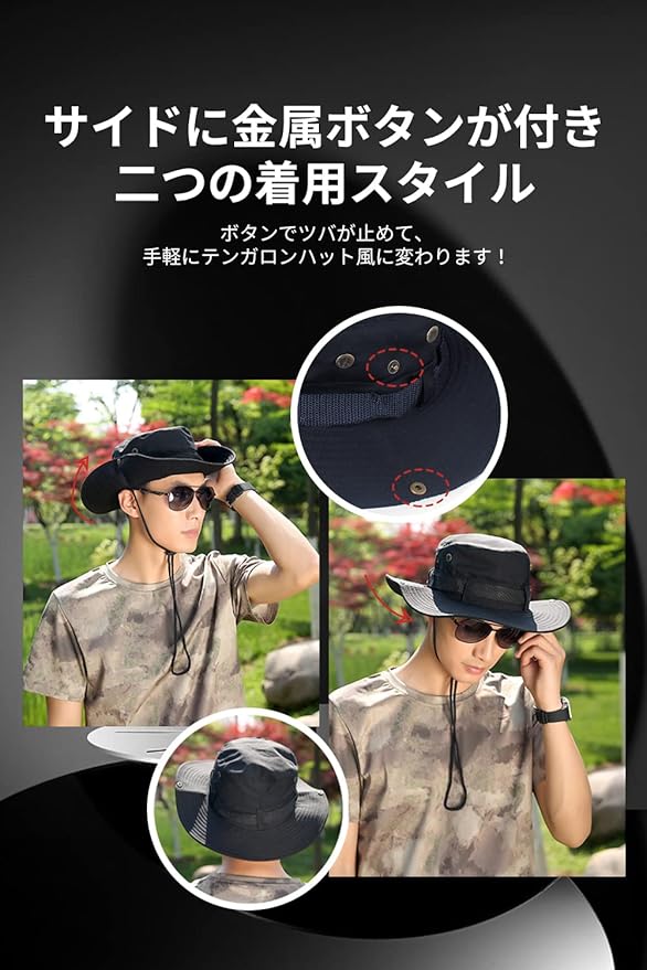 【2WAY着用スタイル】夏の紫外線対策だけでなくオールシーズンでファッションのトッピングとしてお使いいただけるアウトドア 帽子!!サイドにボタンが付き、ボタンでツバが止めて、手軽にテンガロンハット風に変わります。簡単に被ってシルエットも綺麗に保ってくれます。