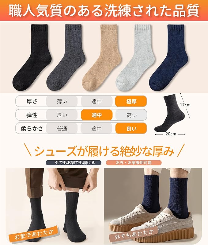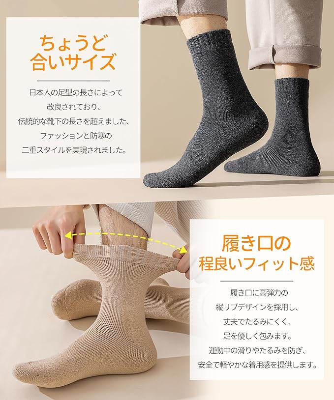 【冬用零下防寒靴下登場!】サイズ:約25㎝~29㎝、重量:約73.5g。適用季節は秋、冬、春です。日本人の足型の長さによって改良されており、伝統的な靴下の長さを超えました、ファッションと防寒の二重スタイルを実現されました。高品質のメンズウールンソックスは、上質なウール(39.9%)とコットン(33.7%)の混紡素材で作られ、保温性と耐久性の完璧なバランスを実現しています。ウール混紡素材は優れた保湿性、吸放湿性、そして暖かさを持ち、体温を維持しつつ蒸れにくい快適な履き心地を提供します。一般的な45gの冬用ソックスと比べて、当社の靴下は厚みがあり、暖かく、通気性と耐摩耗性に優れ、最大74gの重さで零下の環境でも足を暖かく保ちます。