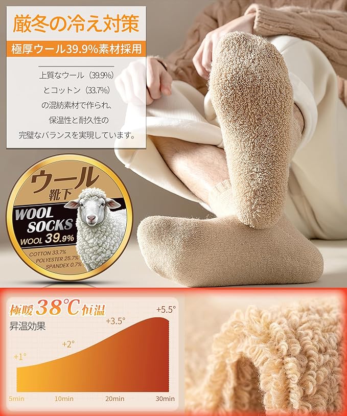 【抗寒力max・極厚ウール39.9%(鑑定済み)】靴下は上質な極厚ウール(39.9%)素材を採用して、丈夫な材料と丁寧な編み方で足全体フィットし、足にピッタリ、ズレにくいです。裏地は極厚手起毛、熱を内側に閉じ込め、空気の層ができることで蓄熱保温性は普通の靴下の5倍以上、厳冬にアウトドアしても保温性が良い 靴下 メンズ 厚手。履き口からつま先まで全部ふわふわとして、まるで暖かい雲に包まれているような、柔らかな肌触りで足全体をやさしく包み込んでくれるから、同時に足の熱量をしっかりとロックさせて、不思議な38℃恒温を実現します。