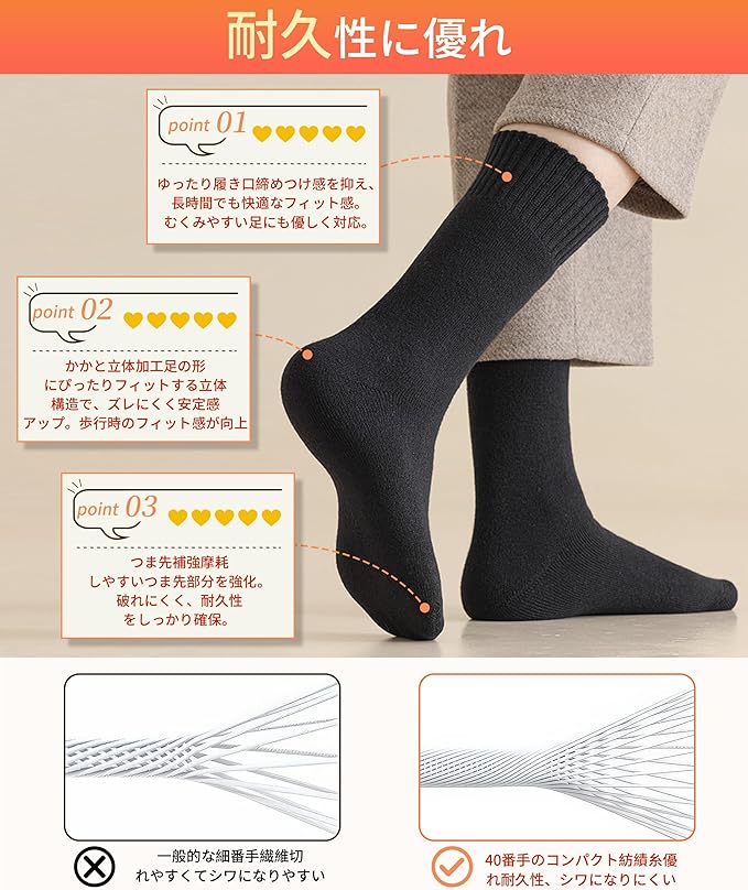 【40%ウール素材で抗寒力MAX】上質な40%ウール素材を使用し、丁寧な編み立てによって足全体にしっかりフィットし、ズレにくく、快適な履き心地を実現しました。足先から足首まで裏起毛たっぷりで、熱をしっかり閉じ込め、空気の層が保温力をさらにアップし、寒さの厳しい屋外でも、これ一足で安心して過ごせます。履き口は締め付け感のないゆったり仕様で、長時間履いてもストレスフリーです。洗濯を繰り返しても型崩れせず、色落ちもしにくい高耐久設計で、冬の防寒対策に欠かせない、メンズ必携のあったか靴下です。