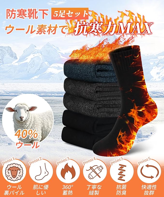 [Lavento] 靴下 メンズ ソックス 冬 【5足セット・ウール裏パイル・耐久性アップ】 防寒靴下 ウールソックス あったか 厚手 防寒 保温 消臭 360 蓄熱 伸縮性 室内 アウトドア スキー スポーツ 24-28㎝