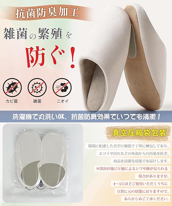 【抗菌防臭効果で足元を清潔にキープ!ニオイを抑える仕様】特殊な抗菌防臭加工が施された素材を使用しており、細菌の繁殖を抑え、長時間の使用でも足元を清潔に保ちます。臭いの原因となる菌の増殖を防ぐことで、履くたびに嫌なニオイを抑え、快適な状態をキープできます。室内での長時間使用やリラックスタイム、家事の最中でも安心して使えます。