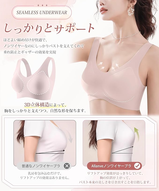 ㊙️【蒸れにくい通気性・肌にやさしい着心地】ナイトブラは柔らかくて肌に優しく薄い生地を採用して、『無縫製』『ノンワイヤー』で、身体に高密着してしっかりと包み込む感覚で安定した着心地を実現します。ノンワイヤーブラは通気デザインで吸湿性・通気性に優れていて、夏場につけても蒸れにくいです。ノンワイヤーブラはきめ細かく滑らかな触感により、肌に負担がかかるものを解消し、締め付け感のないストレスフリーな着け心地を実現しました。