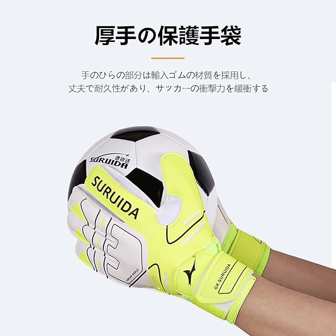 【最大限の保護とグリップ】キーパーグローブの手のひらは、滑り止めのラテックスで覆われています。この厚みのあるラテックスは、最大限の保護とグリップを提供します。これにより、サッカーボールをしっかり掴み、ゴールを守る信頼性が向上します。