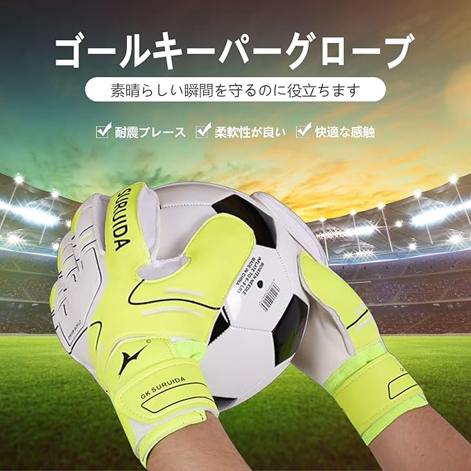 【高品質の PU 手の甲】サッカーグローブの手の甲は、高品質のPU素材で製作されています。この素材は耐摩耗性と衝撃吸収性に優れ、長期間の使用に耐えられます。手の甲には通気性もあり、快適な使用感を提供します。