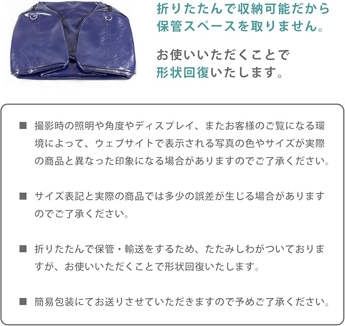 【ご注意】撮影時の照明や角度やディスプレイ、またお客様のご覧になる環境によって、ウェブサイトで表示される写真の色やサイズが実際の商品と異なった印象になる場合があります。サイズ表記と実際の商品では多少の誤差が生じる場合があります。折りたたんで保管・輸送をするため、たたみしわがついておりますが、お使いいただくことで形状回復いたします。簡易包装にてお送りさせていただきますので予めご了承ください。
