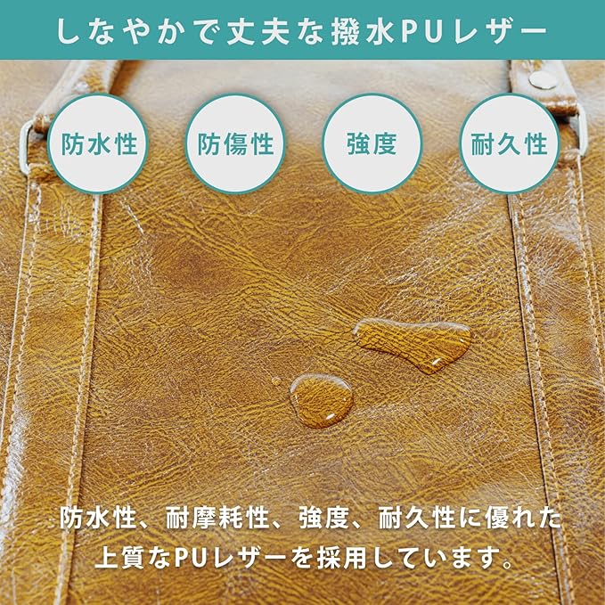 【カラー・素材 / サイズ】カラーはブラック、ブラウン、アッシュブラウン、ネイビーの4色展開で素材はPUレザー(撥水加工)。 / 横幅約50cm 奥行き約26cm 高さ約28cm、持ち手長さ:約20cm、ショルダーストラップ:約116cm、容量:約32L、重さ:約600g。