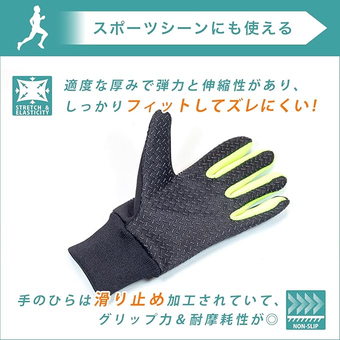 【スポーツ時の動きやすさを追求】ストレッチ性のある素材を、手のカーブに合わせて立体裁断しているので、運動時に手や指を動かしやすく、手をしっかりと握り込めます。スポーツ時の操作性を追求し、手のひら部分は耐摩耗性とグリップ力を効果向上させる滑り止め加工も施しました。
