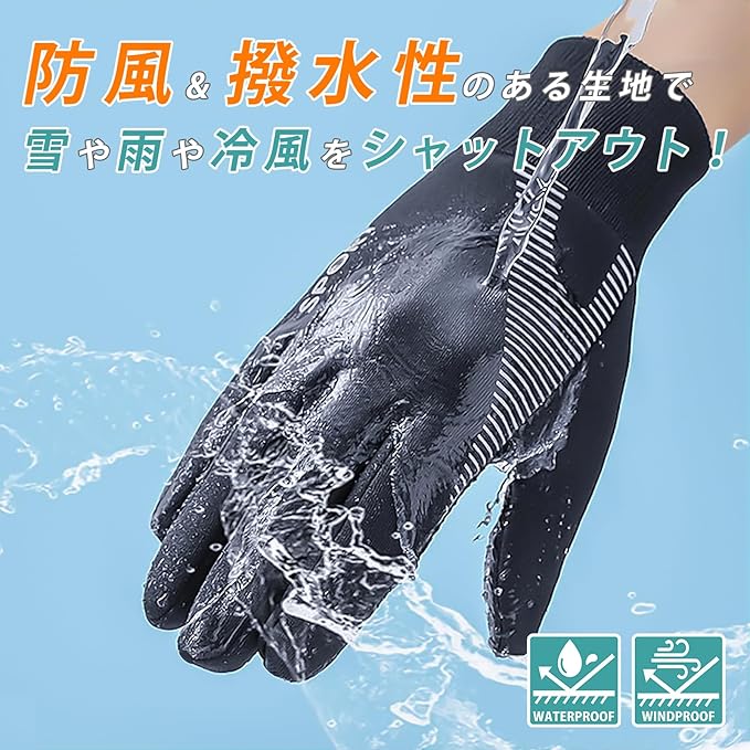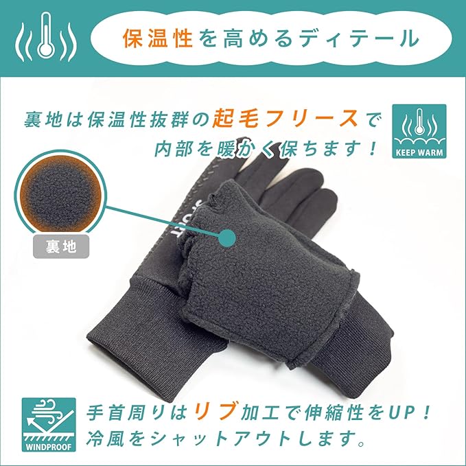 【防寒性&撥水加工】グローブの裏地は指先まで柔らかな起毛フリース素材を採用することで高い保温性を実現。表面は撥水加工を施しているので小雨や雪の日でも問題なく使用でき、アウトドアでスポーツをする際などでの使用にも適しています。
