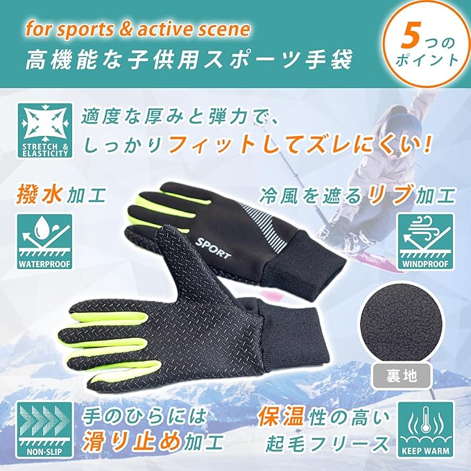 【幅広い用途に使える!】防寒性と操作性が高く、防水性備えているので、通学などの普段使いはもちろん、自転車、サッカー、野球、ゴルフ、テニス、登山、雪遊びなど、様々なシーンで幅広く使える子供用の防寒グローブです。子供たちへのプレゼントにもオススメです。