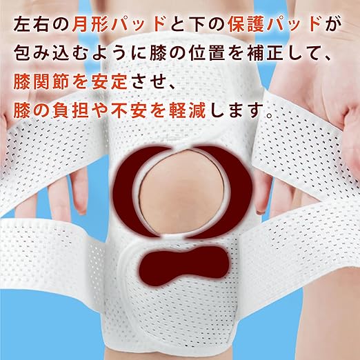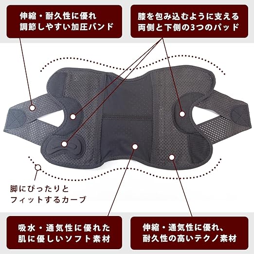 【商品概要】伸縮性のあるバンドで締めるタイプの膝サポーター(膝下のパッドが配置された改訂版)です。左右共通タイプで、バンドの加圧具合はご自身で調整可能。性別、年代を問わず、日常生活においてはもちろん、激しいサポーツをする際にもご使用いただけます。