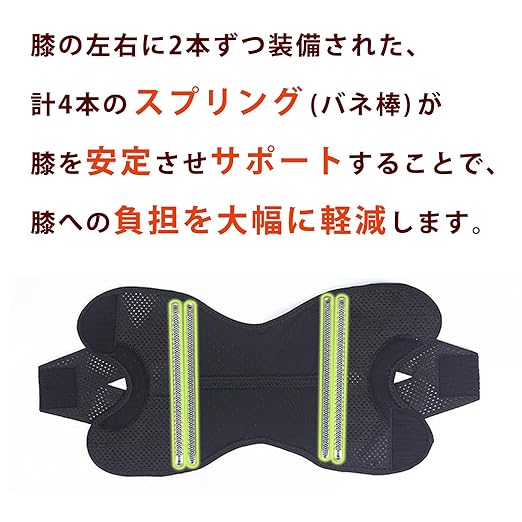 【構造・使い方】膝の両側と下側の3箇所に配置したパッドで位置を安定させながら、バンドで調整することで膝関節にピッタリとフィットさせ、膝を安定させることができます。膝の両側には金属のサイドバネを計4本設置しており、膝の動きを妨げることなくサポートし関節の動きを安定させながら補助します。固定する強さはバンドの締め方の強さによって自在に調整可能です。