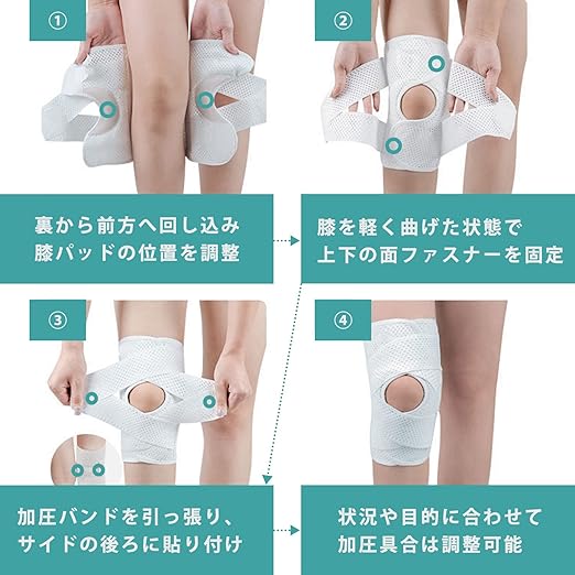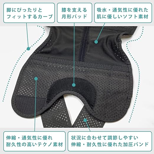 【商品概要】伸縮性のあるバンドで締めるタイプの膝サポーターです。左右共通タイプで、バンドの加圧具合はご自身で調整可能。性別、年代を問わず、日常生活においてはもちろん、激しいサポーツをする際にもご使用いただけます。