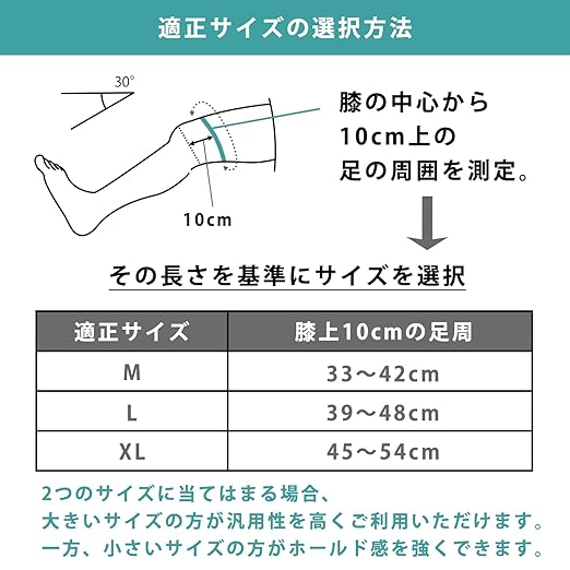 【適合サイズ】膝上10センチの周囲を測定してサイズをお選びください。Mサイズは膝上10センチの周囲が33〜42cm、Lサイズは膝上10センチの周囲が39〜48cm、XLサイズは膝上10センチの周囲が45〜54cmの方に適しています。(※2つのサイズに当てはまる場合、大きいサイズの方が汎用性を高くご利用いただけます。一方で、小さいサイズの方がホールド感を強くできます。※衣類の上から装着する場合には、衣類の上から足の周囲を測定してサイズを選定してください。)
