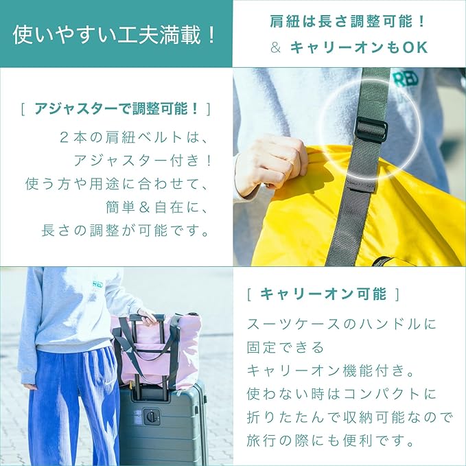 【キャリーオン&コンパクト収納】 スーツケースのハンドルに固定できるキャリーオン機能付き。使わない時はコンパクトに折りたたんで収納可能。肩ひもの長さも調整でき、使う人やシーンに合わせてフィット。