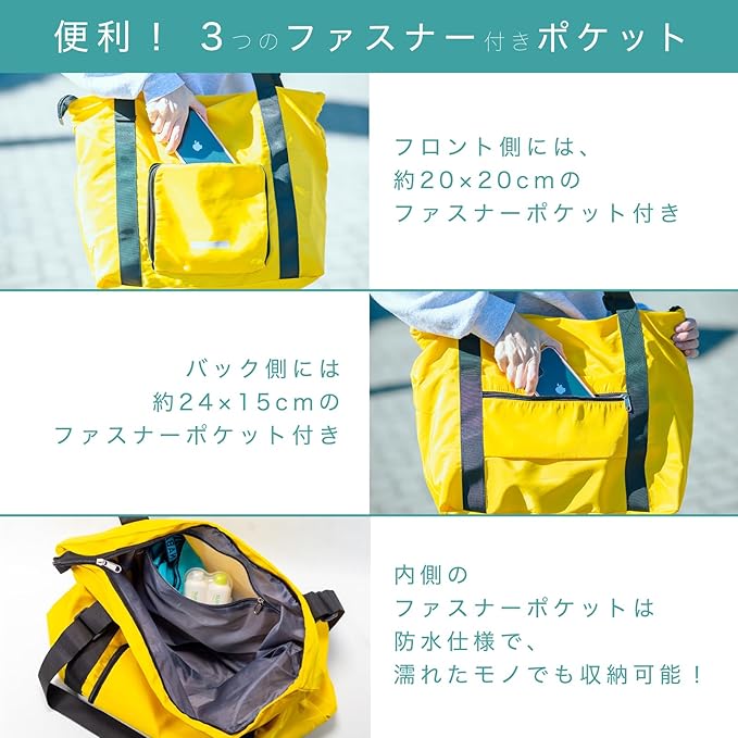 【メイン収納+3つのファスナーポケット付き】メイン収納部分にはファスナーが付いているため、中身が見えたり落ちたりする心配なし。さらに、外側には前後に各1つずつ、計2つのファスナー付きポケットを搭載。内側にも1つ、防水仕様のファスナー付きポケットがあり、濡れたものを分けて収納するのに便利です。