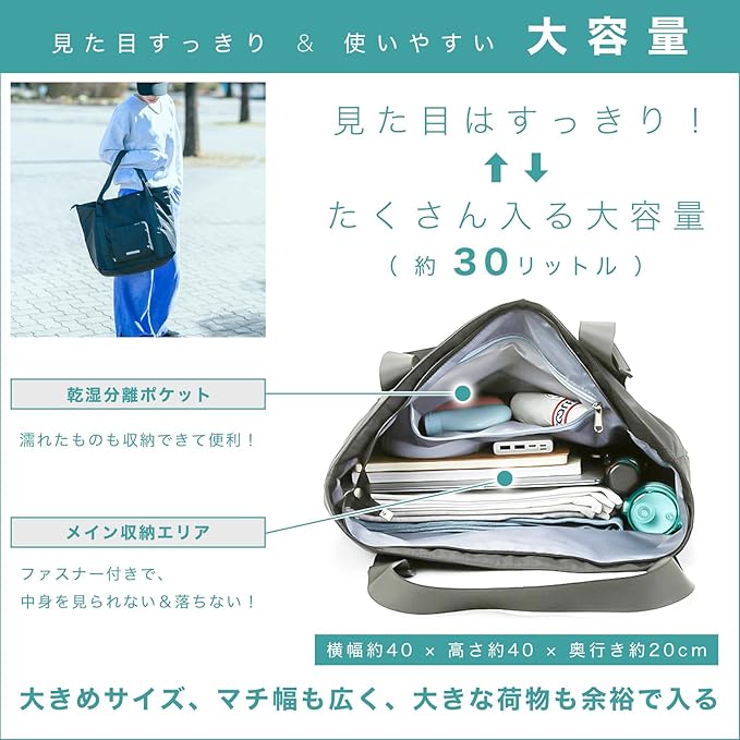 【軽量&大容量のVarioTote(バリオトート)】 約30Lの大容量なのに、軽くてコンパクトに収納可能なトートバッグです。スーツケースのハンドルに固定できるキャリーオン仕様。ユニセックスに使えるシンプル&スタイリッシュなデザインで、旅行・通勤・通学・ジム・アウトドアなど幅広いシーンで活躍します。