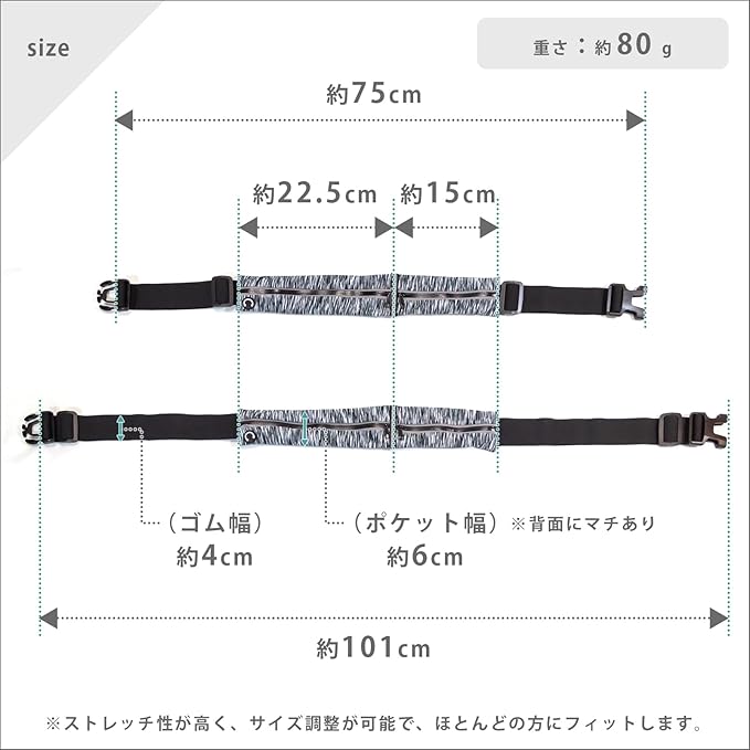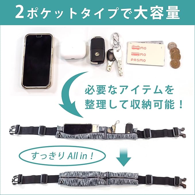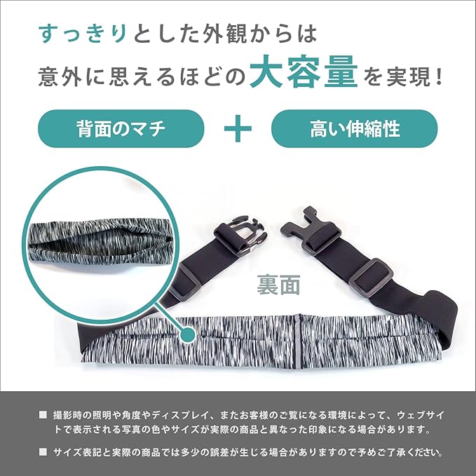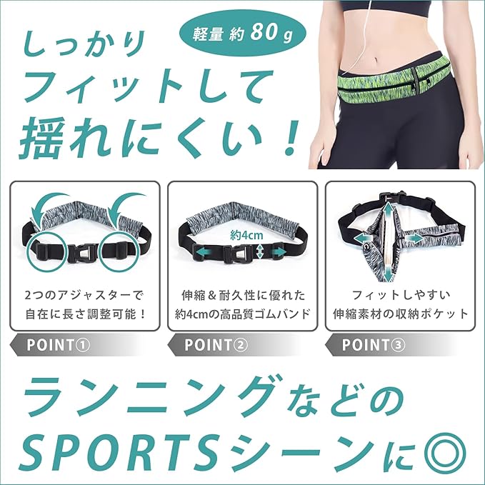【商品概要】必要なものをコンパクトに収納できて、着用していてもスポーツの妨げになりにくい、薄型で軽量のランニングポーチです。素材自体に伸縮性のあるポーチを、耐久性・伸縮性の高いゴムベルトで体にぴったりとフィットさせて使用することで、運動時にも、揺れにくく、ズレにくく、邪魔にならないように設計されています。