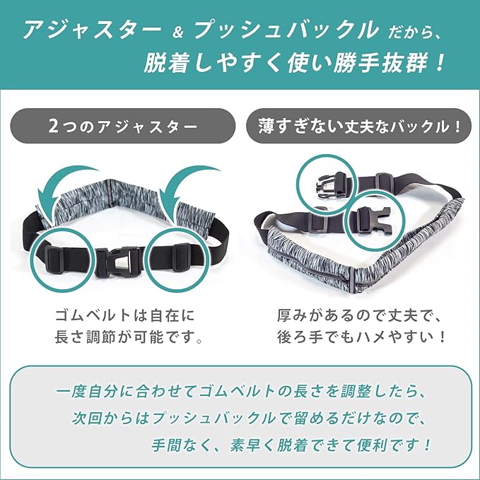 【便利なプッシュバックルタイプ】ゴムベルト部分には2か所にアジャスターがあり、長さを自在に調整可能。長さを調整したら、プッシュバックルで素早くしっかりと装着できます。一度自分に合わせてゴムベルトの長さを調整したら、次回からはプッシュバックルで留めるだけなので、手間なく、素早く装着できて便利です!