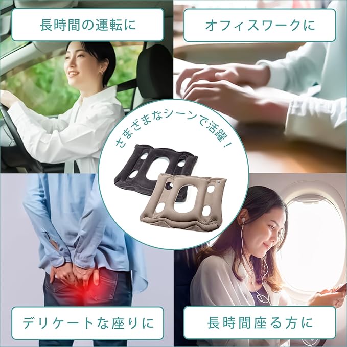 【 長時間の座りも快適!体圧分散エアクッション「AirFIT-350(エアフィット350)」】 空気が体圧を分散し、座り心地を快適にするエアクッションです。デスクワーク・ドライブ・旅行・オフィスなど、長時間座る場面でも活用可能!空気注入の調節で、好みの柔らかさ&厚さに変更可能。長時間座る方やデスクワークが多い方にもおすすめです。