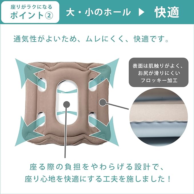 【 ムレにくく、快適な座り心地 】 大小のホールが空気をスムーズに流し、蒸れにくい設計。さらに、表面フロッキー加工で肌触りも◎。サラッとした座り心地が続くので、夏場や長時間の使用でも快適です。