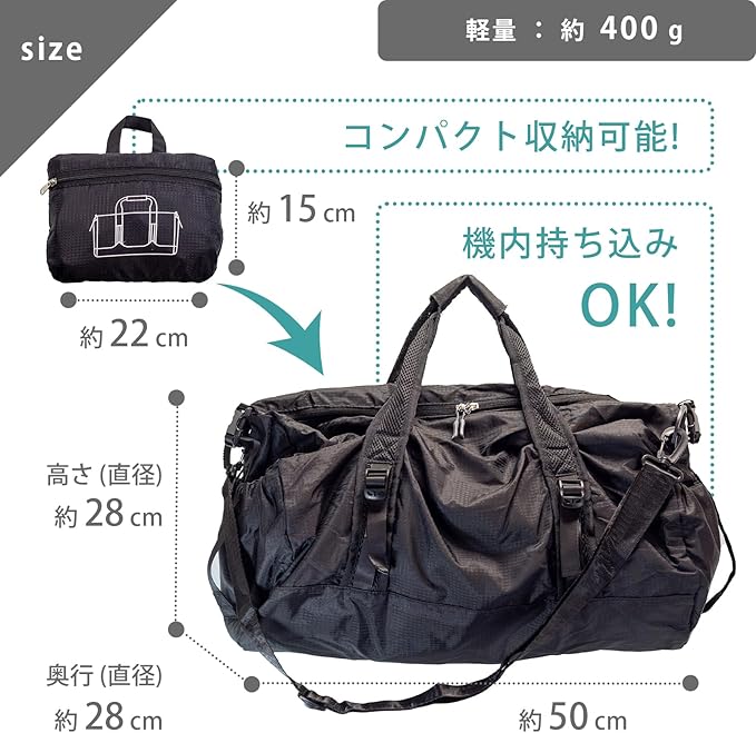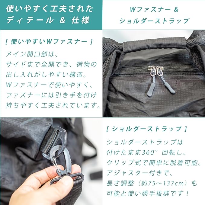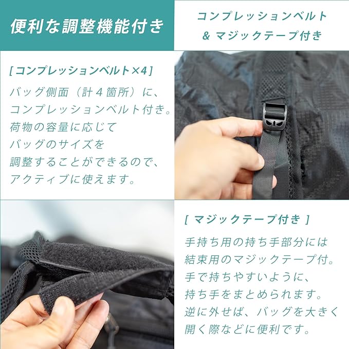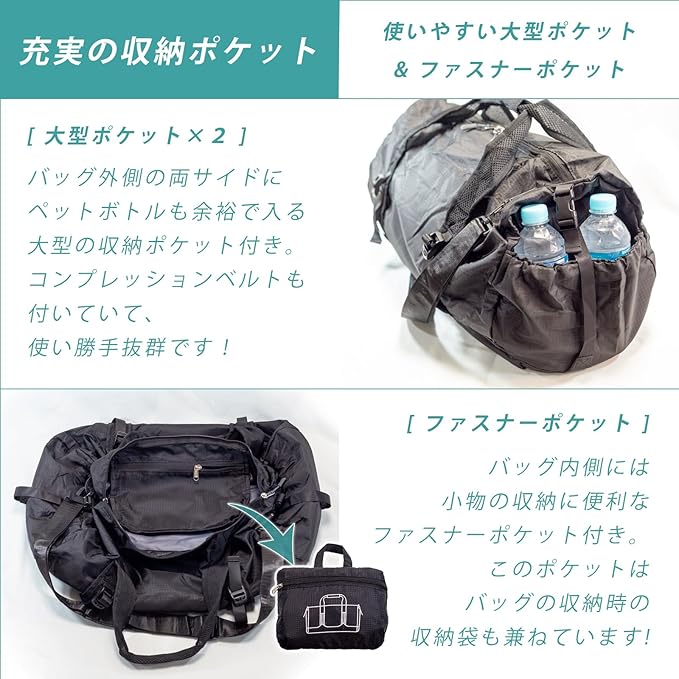 【軽量&丈夫で抜群の機能性!】軽量で丈夫なナイロン素材を採用。軽量&コンパクトに折りたたんで収納でき、荷物の量に応じて調整できるコンプレッション機能が付いているのは前述した通り。さらに、大きめのサイドポケットやシッパー付きの小物ポケット、取り外し可能で長さも調整可能なショルダーストラップなども装備され、機能性は抜群です!