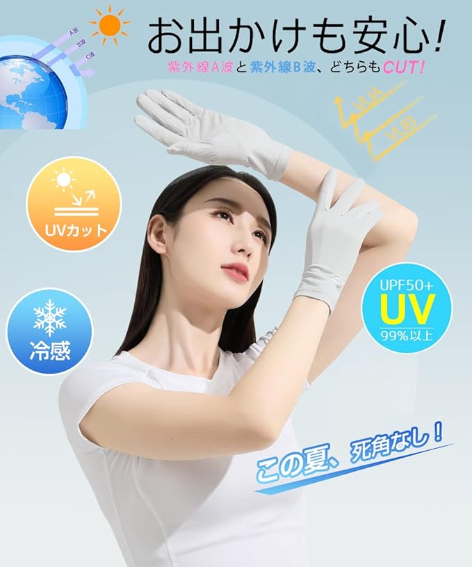 【UVカットでお肌を優しく守る】日焼けをすると、皮膚のバリア機能にダメージを与えるため肌が乾燥、老化しやすくなります。暑い夏の時期で紫外線対策から日灼けしやすい肌を守ることが重要になります。 手袋のUVカット率は99%以上であり、高エネルギーの紫外線を強力に吸収することで紫外線から両手を守り、夏の紫外線対策に最適なUVカット手袋です。