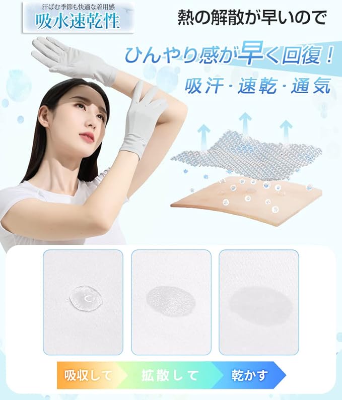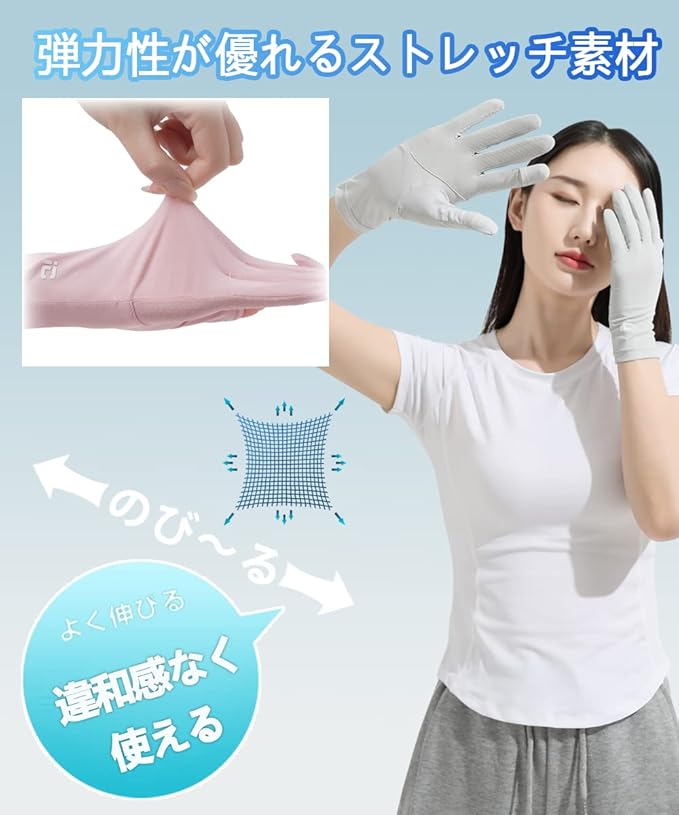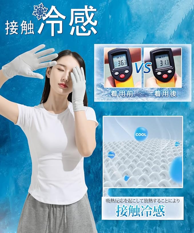 【接触冷感で暑い季節にうれしい】ひんやりしていて、春夏秋にピッタリのUVカット手袋です。冷感素材を採用して、水や汗で濡れると気化熱の作用により冷却効果があり、タッチすると涼しい感じがします。 吸湿性、放湿性も優れているので、蒸れなくサラサラとしたつけ心地で夏でも快適ご使用いただけます。