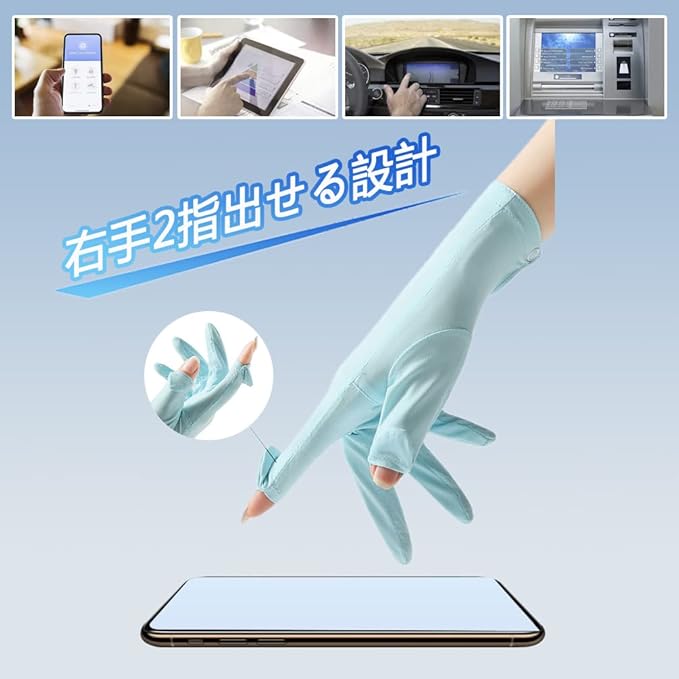 【右手2指出し/タッチパネル対応】日焼け防止手袋の親指や人差し指の指先部分は指出せる設計で、手袋を外さなくても細かい作業が楽になります。ウトドア活動に突然の着信やメールを受信した場合でもわざわざ手袋を外す必要もありませんので、とても便利です。自転車や車の運転などに適した紫外線対策と動きやすさを兼ね備えた着け心地のよいUVカットグローブです。