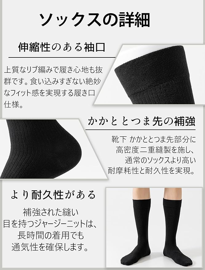 【機能的なデザイン】ビジネスソックスつま先とかかと部分のストレスポイントを二重縫いすることで、毎日の着用に耐えます。クラシックなハニカムストレッチカフと二重層のゴムバンドは、ふくらはぎにぴったりフィットし、締め付け感、ずれ、しわを寄せ付けず、しっかりと固定します。