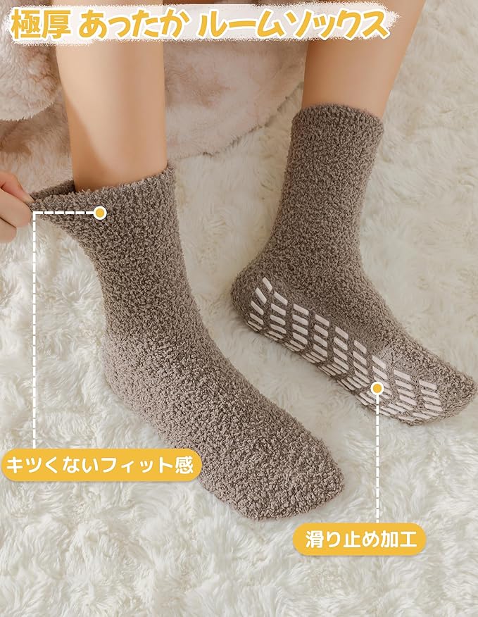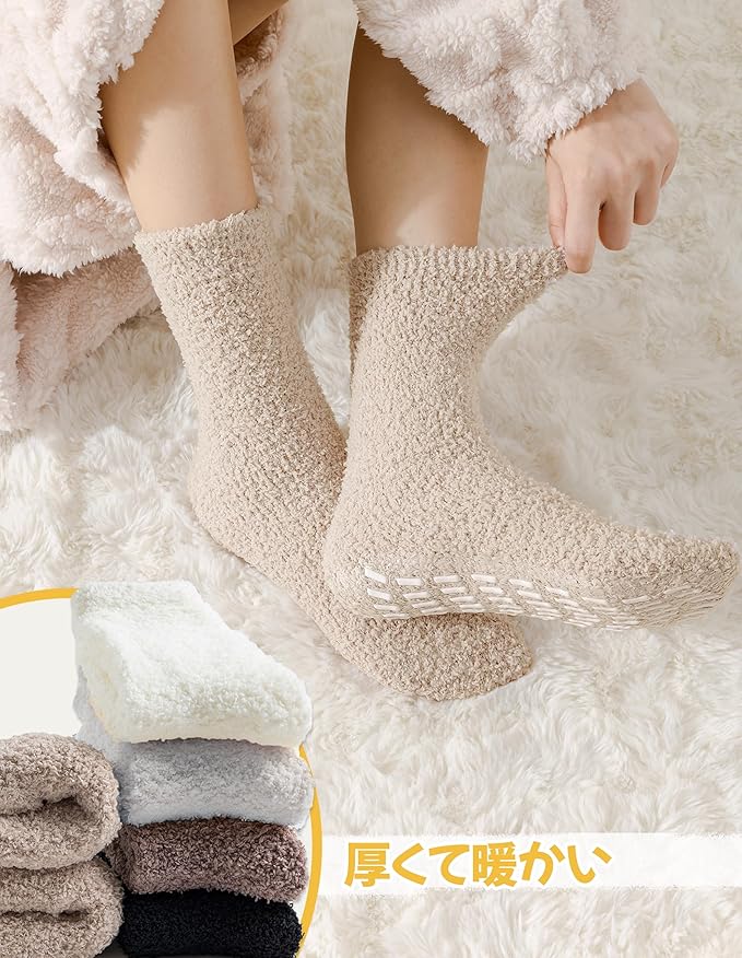 滑り止め設計: ソックス裏面のシリコンポイントがしっかりとグリップし、滑りやすい床面でも安心して歩行可能。女性向けの超柔らか滑り止めモコモコ靴下で、つま先までほっこり温もりを。