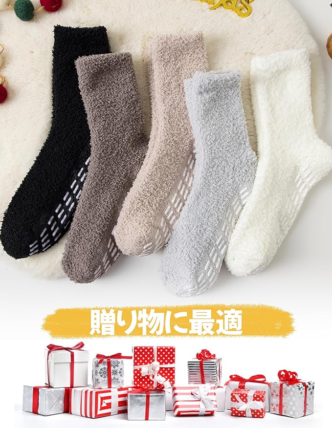 5足組の滑り止めシリコンポつきのあったかソックス。超柔らかで暖かく、サイズ22-25cm対応。寒い季節の自宅やリラックスタイムに最適な相棒。