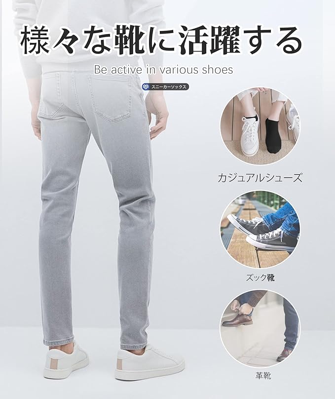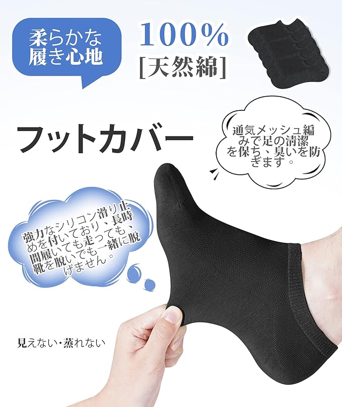 【シンプルで履きやすい】フットカバー型なので、外から見えづらく、スニーカーや短靴、スリッポンなどと合わせると、素足のような印象に。