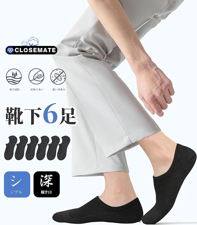 [CLOSEMATE] 靴下 メンズ アンクルソックス フットカバー 防臭吸汗 くるぶし靴下 スニーカー用 ショートソックス 黒い 深履き 6足 脱げない 吸湿通気 オールシーズン対応 破れにくい ズレない
