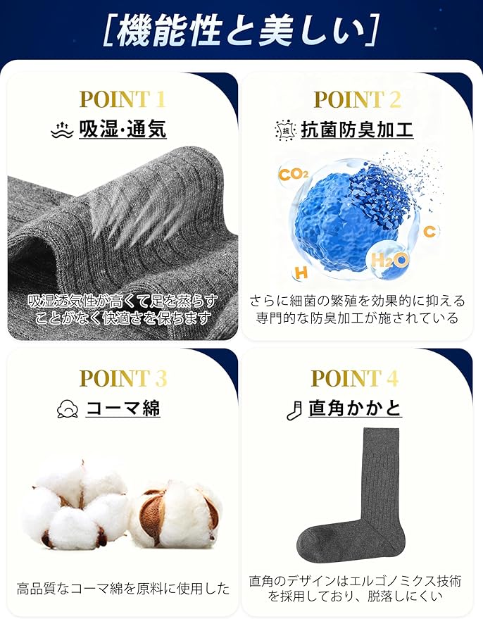【優れた素材】高品質なコーマ綿製のクルーソックスは、手に取れば分かる柔らかさで肌に優しく刺激少なく親肤性が高いです。優れた吸水性で足汗を速吸収し乾燥を保ち、長時間履いても足に疲労や負担がなく心地よい履き心地を持続します