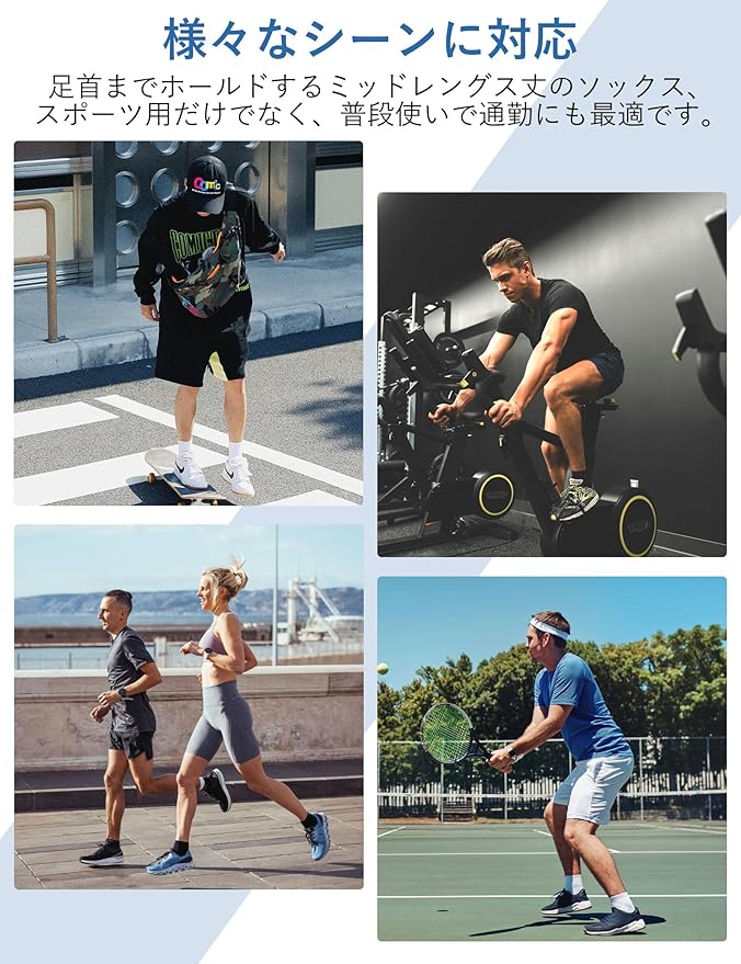 【幅広いソックス】くるぶし上の足首まで見えるミッドレングスソックスで、ランニングはもちろん、ゴルフなどの様々なスポーツ、シーンを選ばず履けるデザインとカラーが魅力。