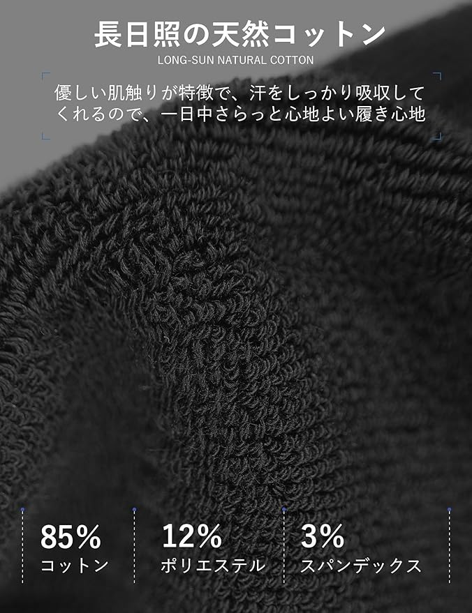 【吸汗・通気・防臭】天然綿とポリエステルを採用して肌にやさしいです。甲部分には通気性の高いメッシュ素材を採用し、気になる臭いの元となる蒸れを防ぎ、長時間の着用でもサラサラ。快適さと機能性を追求した、スポーツ愛好者に必要な一足です。